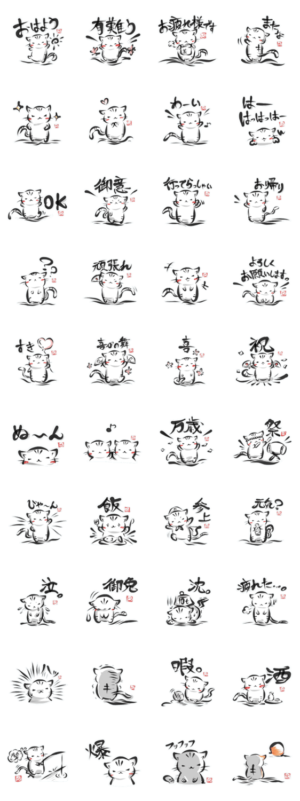 筆文字風のスタンプ。筆で描いたような猫が魅力的!和風・シンプルなのが好きな人、書道や水墨画が好きな人も必見!子どもからおじいちゃんおばあちゃんまで是非使ってね!ユナシ より発売