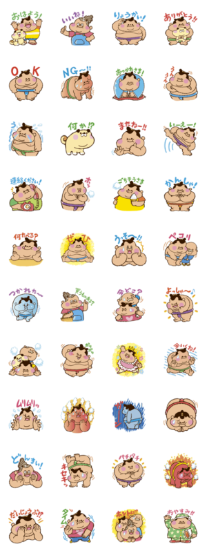 相撲が大好きすぎる『もっちり相撲一家』。ぽっちゃり体型の長男「もっちもち山」が金星夢見てがんばる姿のスタンプ。あくまでも趣味だけど、家族みんなで応援しています!柴崎ヒロシ より発売