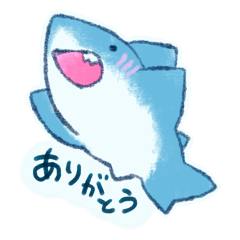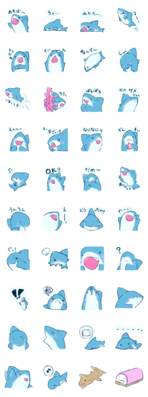 ずんぐりまんまるい、さめまる。ゆる~くかわいいフォルムですが、これでも鮫(サメ)なんです。パステル風のやさしいタッチで、日常会話に使いやすいスタンプです。