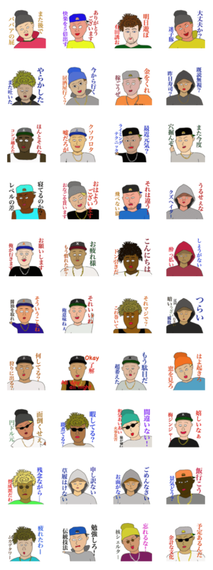 卓越したライミングスキル披露できるスタンプ。このスタンプを送ればラッパーの仲間入り。これらの韻をサンプリングするのもよし。y.a より発売
