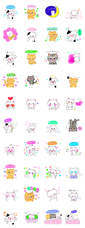 ぶちねこ、アメリカンショートヘア、茶トラネコ、白猫がお風呂入ったり、読書/勉強したり、眠れなかったり・・・おちゃめな猫スタンプ♪毎日使う言葉など日常基本セット!えみ にゃんこ より発売