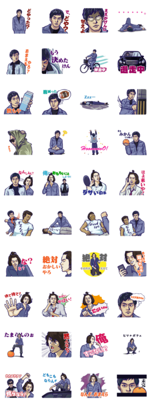 柳楽優弥が演じるけんかに明け暮れる主人公泰良と、お団子ヘア高校生裕也のスタンプが登場!映画の舞台である愛媛の方言、伊予弁で盛り上げよう!
