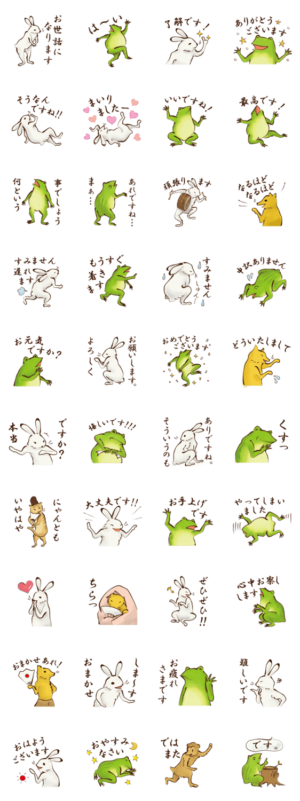 鳥獣戯画モチーフの、カエルとウサギの和風スタンプ第三弾。日常会話でよく使う敬語です。三浦さくりーぬ より発売