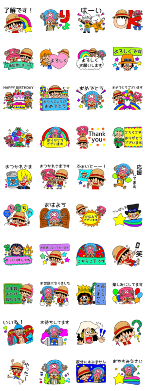 ONE PIECE(ワンピース)コラボスタンプ。ルフィ、チョッパー、サンジ、ゾロなど大人気キャラクターが勢揃い!カラフルPOPに仕上げました。毎日使える日常会話スタンプ。