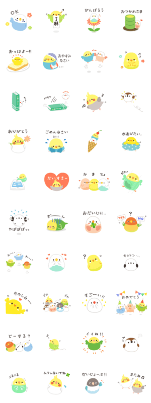 セキセイインコ、オカメインコ、文鳥…など、まるまるっとしたことり達がいっぱい詰まったスタンプ。鳥好きさんにオススメです♪kazunoco より発売