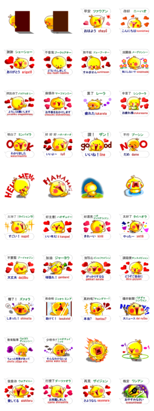 中国語(台湾語)と日本語の吹き出し ひよこ スタンプ画像一覧