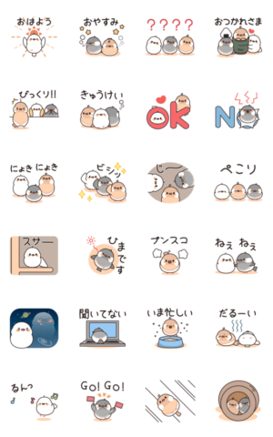 仲良しな文鳥3羽のアニメーションスタンプです!リアクション豊富で友人や家族に使いやすい♪DECOR より発売