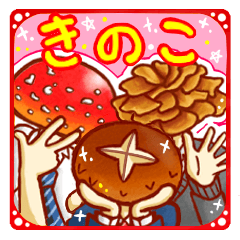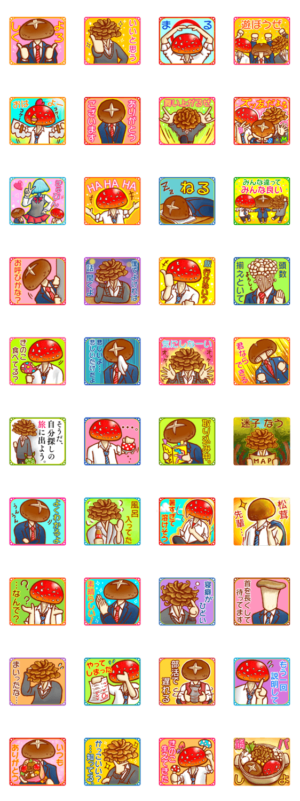 頭がキノコな男子高校生!?しいたけ、舞茸、ベニテングタケによる、シュールでちょっぴりおバカな異形頭スタンプ!エノキダケ、エリンギ、松茸なども!ひじりやノエル より発売