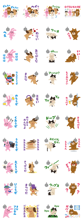 いらすとやのウサギと犬と猫とクマのキャラクターがパーティで楽しく踊っているラインスタンプです。みふねたかし より発売