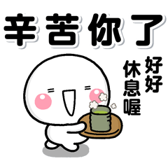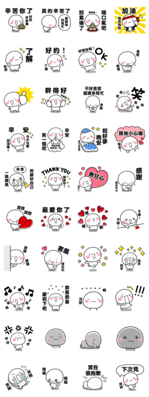 通常の基本言葉に気持ちが伝わるよう小さな文字を追加したしろまるスタンプの台湾語verです。【いしいともこ作】