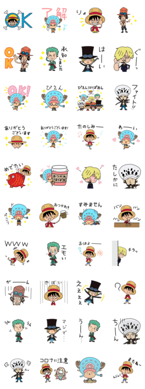 ONE PIECEの毎日使える便利なスタンプです。ルフィ、チョッパー、ロー、ゾロ、サンジ、サボ、エース等が日常会話をゆるーく盛り上げます。期間限定発売となります。