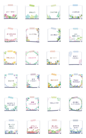 花の付箋スタンプ。好きなテキストを自由に入力して、毎日の挨拶やおしゃべりにご利用ください。 現在この商品は一部のスマートフォン版LINE 10.3.0以上のトークルームでのみ使用できます。動作環境の最新情報はヘルプをご確認ください。acacia より発売