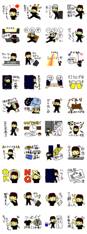 裏方さん(舞台さん・音響さん・照明さん)がよく使う言葉や、行動をスタンプにしました。 裏方さん同士のコミュニケーションにどうぞ。