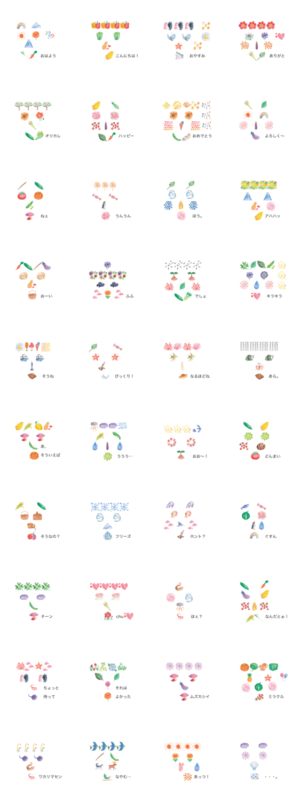 ポジ彩の絵文字を並べたらシュールな顔スタンプに。かわいい花や魚、野菜などで色々な表情を表現。オリジナルが作りたくなったら絵文字があれば組合せ無限大です!shimashima より発売