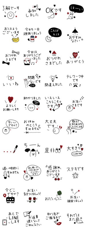 シンプルで手書きっぽいイラストの可愛いスタンプ、種類が豊富なので毎日使えます。
