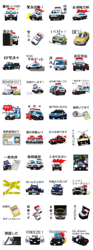 パトカーのスタンプです。LINEの治安を守る全ての人に!もちろん警察官の皆さんにもお勧めします!NOUTOMIHIDEAKI より発売