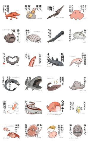 かわいくて奇妙な深海生物のスタンプです。 中にはちょっと違う子もまじっています。もっち より発売