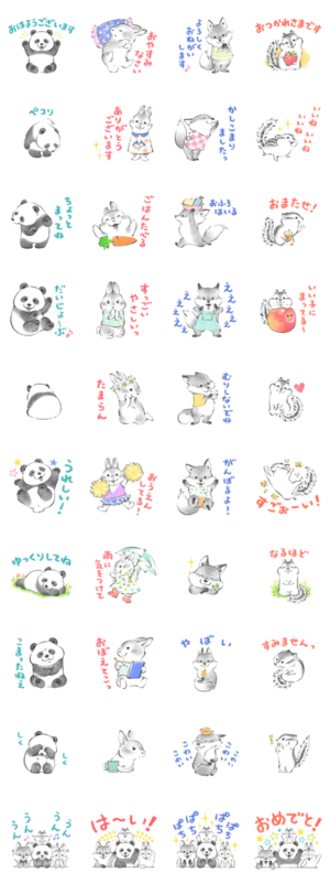 毎日使える言葉が入った優しいどうぶつ達のスタンプ。今回はパンダ、ウサギ、キツネ、リスです。※以前と内容同一の再販
