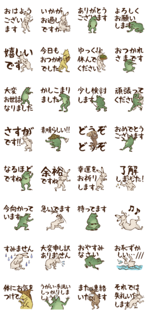 人気の鳥獣戯画をモチーフにした、和風のでか文字スタンプ第2弾です。可愛い敬語のウサギ、カエル、サル、キツネ、ネコがあなたの日常会話を彩ります。三浦さくりーぬ より発売