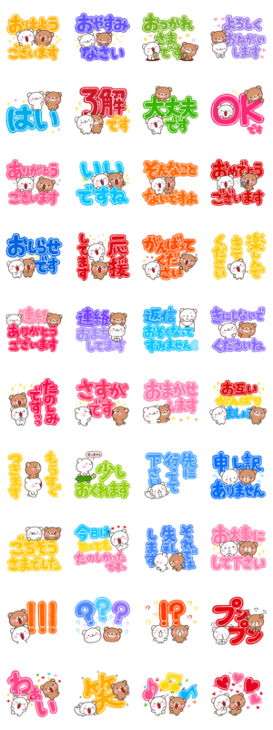 スタンプの文字が小さくて見えない!という声にお応えして大きな文字の使いやすい内容を集めたスタンプです。今回はくまさん敬語きほんverです。【作:いしいともこ】