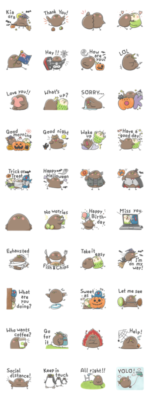 ニュージーランドの飛べない鳥・キウイのスタンプ第3弾。キウイの仲間のカカポとタカへと一緒にハロウィンを楽しんじゃいましょう! 英語/イベント/魔女/黒猫/秋/おばけしょーへい より発売