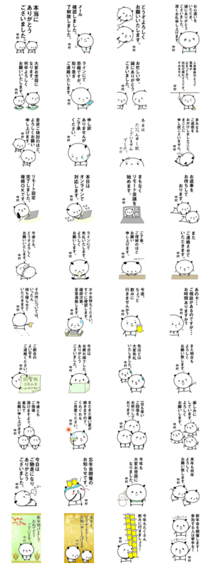 なかむら用、夏のご挨拶や年末年始、毎日の会社のやり取り会話、敬語丁寧、挨拶お礼、お誘い、宴会飲み会、一年中仕事の会話、文章多めのシンプルぱんだのビッグスタンプ ※このスタンプはトークルームで大きく表示されるBIGスタンプです。analogue designs より発売