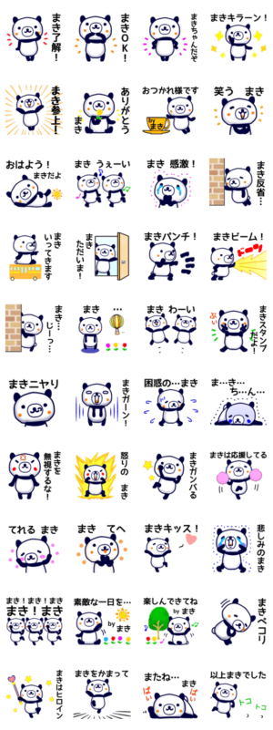 パンダのマキさんスタンプです。真木さん、巻さん、真紀さん、麻紀子さん、まだまだたくさんのマキさんへ。是非使ってみて下さい。よろしくお願いします。ペコリ より発売