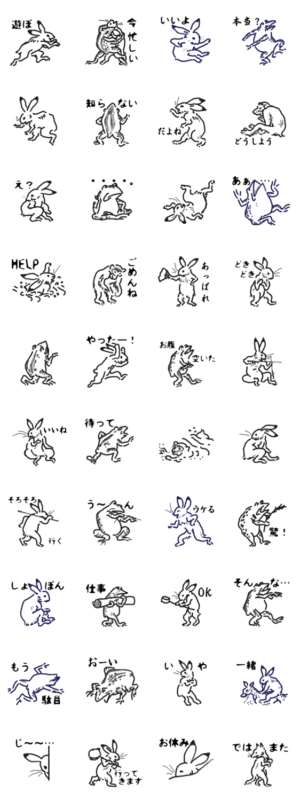鳥獣戯画をモチーフにした、素朴で使いやすいスタンプです。動物たちのユーモラスな表情をお楽しみください。みくま川 より発売