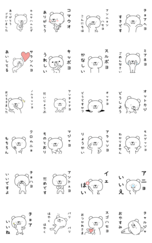 いろんな外国語を話すクマのスタンプ動く韓国語編。簡単な日常会話等のハングルのカタカナ読みと日本語訳スタンプただのヒト より発売