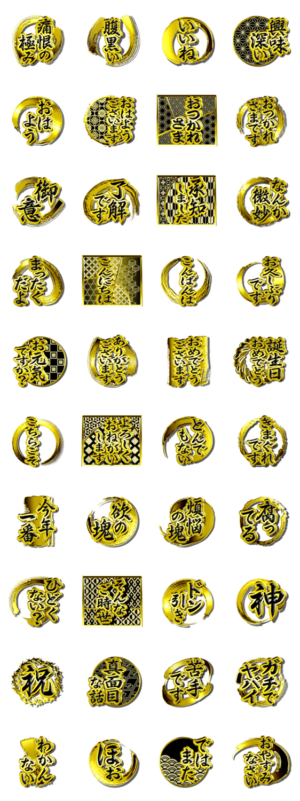 ゴールドと漆黒で大人の高級感あるデカ文字スタンプ、おはようからおやすみ、お疲れ様、おめでとうなどのよく使う日常会話を和風調で豪華に伝えます