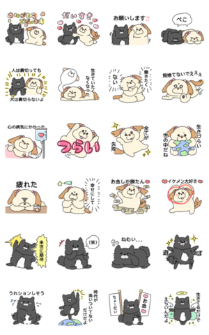 ちょっとメンヘラでわがままだけど最強に可愛いマルチーズとMダックスのMIXのきなこもちさん(女の子)とイケメン黒ポメラニアンのバン君(男の子)の可愛すぎるスタンプです♡きなばん より発売