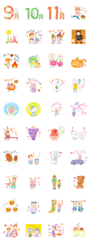 秋に使える日常会話や挨拶のスタンプです。ハロウィン、お月見、敬老の日、紅葉狩りから、かぼちゃ、焼き芋、柿、栗、オバケなど秋のモチーフのキャタクターがいっぱい。pumpkin より発売