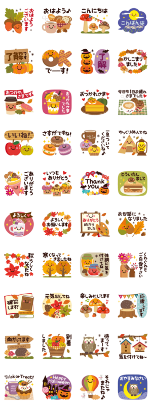 ちょっとだけ大人の、ほっこりカラーの秋スタンプ。ハロウィンはもちろん、よく使う言葉が色々あって便利♪