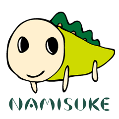 なみすけは、恐竜のような妖精です。趣味は散歩と人間観察。特技は、背中のひれで空気をきれいにすること。 (なみすけ承認番号第28-49号)
