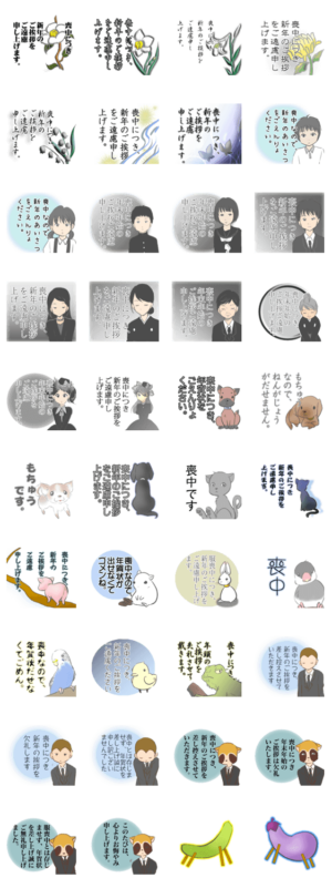 目上の人用、同輩用、友人用、ペット服喪中など、種類豊富な喪中スタンプを用意しました。南 より発売