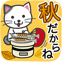 かわいい猫の秋スタンプです。銀杏、紅葉、十五夜、お月見、七輪、サンマ、焼き芋、どんぐり、松ぼっくり、コスモス、ブドウ、ワイン、ボジョレ、秋祭り、ハロウィンなど。Misato より発売