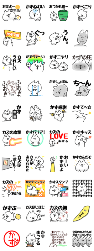 かず、ちゃん、さん、君(くん)が使える、ゆるい名前/あだ名スタンプ。カズ/kazu/かずこ/かずみ/かずよ/かずお/かずき/かずひろ/和/数/寿/一/かず専用1ねこ/山田まぽん作山田まぽん/名前スタンプ より発売