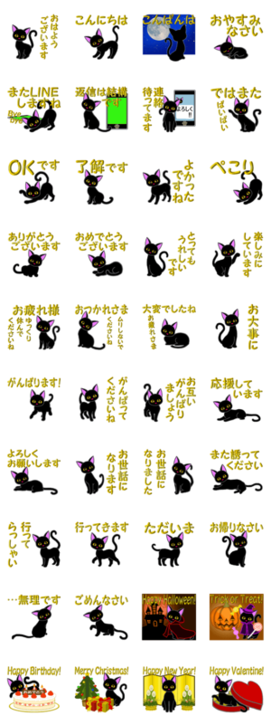 金色お目々の黒猫がご挨拶。ちょっと丁寧で毎日使う言葉が金色の特大文字で入っていますので、目上の方や年配の方にもどうぞ。ハロウィン・クリスマス・バレンタインにも。つのっち より発売