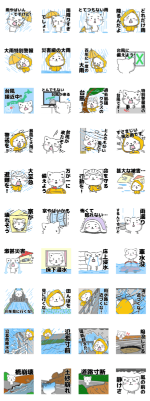 台風シーズン到来!猛烈な風、すさまじい雨、河川氾濫の危険性が高いとき、避難を余儀なくされるような台風の時に使えるかもしれないスタンプ。