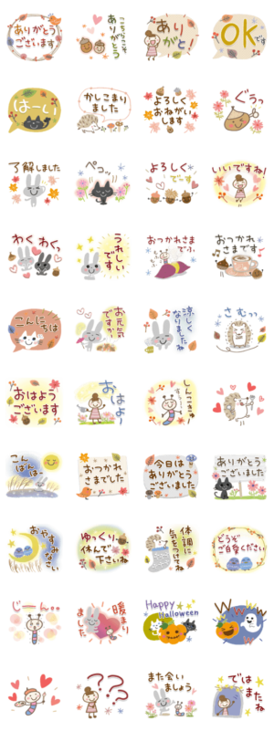 秋色のカラフルなスタンプです。季節のご挨拶や毎日の会話にも使えます♡ひらりーーの大人の気遣いシリーズ9 うさぎ/猫/ハロウィン/挨拶/敬語/はりねずみ/秋/季節ひらりーー より発売