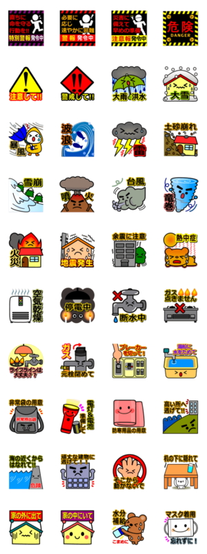 地震や台風、洪水などの自然災害、安否確認に役立つスタンプです。hinco より発売