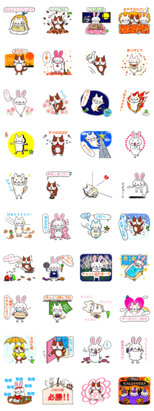 秋の日常に使いやすい、ハロウィン、焼き芋、落ち葉、お鍋、合格祈願、受験、雪、など盛り沢山なスタンプです。かわいい犬・猫・うさぎをよろしくお願いします。