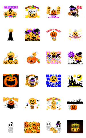 ハロウィンの定番キャラクター、カボチャ、オバケ、ミイラ、がいこつがおもしろ可愛い動きでスタンプになりました! スタンプでもハロウィンをもりあげよ~♪