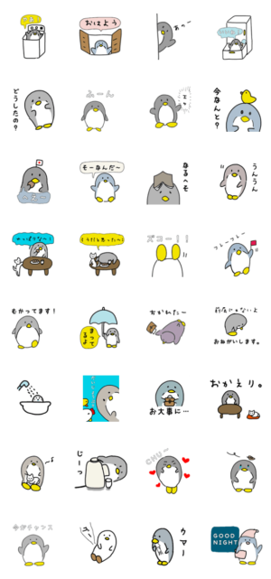 リアクション・あいづち上手なかわいいペンギン。おはよう、いってきます、おかえり、ただいまの基本の挨拶も網羅。これさえあれば毎日使える?素朴なスタンプ。のほほん。OMORINGO より発売