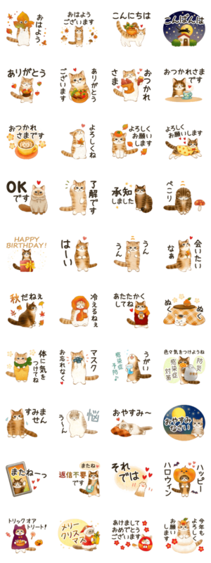 日常使いやすい基本のスタンプと、ハロウィン・クリスマス・お正月などに使えるスタンプのセットです。友だち同士で使えるものから敬語まで。秋と冬にどうぞ♪