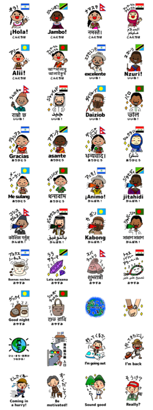 JICA海外協力隊のある地域ならではの国際色豊かなスタンプ。自慢の方言とともに、その日の気分でいろいろな国の挨拶を楽しもう。 ※このスタンプはトークルームで大きく表示されるBIGスタンプです。みなこいワールドフェスタ より発売