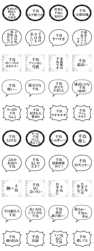 千鳥さんファン専用の、好き/推し/ガチ勢/ラブ/ロスを吹き出しのセリフにして送る名前スタンプです。Toda より発売