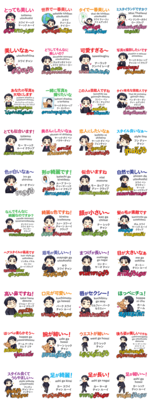 タイ語と日本語でタイ人と日本人が会話でよく使う美に関する言葉を選びました。ワンプッシュで円滑なコミュニケーション。タイ人と日本人が仲良くなるスタンプです。