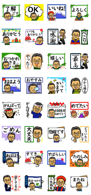 笑顔がまぶしい中高年のスタンプです。表情豊かで見やすくなっています。
