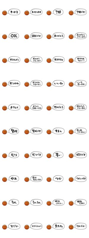 縦幅をあまり取らずに挨拶をするバスケットボールのスタンプです。バスケ部の方とかにどうぞ。シンプルに毎日使いやすい基本的な挨拶のフレーズです。敬語もあります。オカヤマ より発売